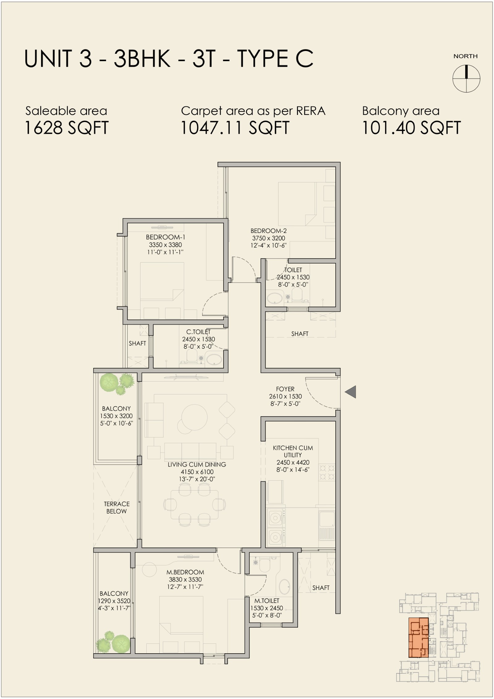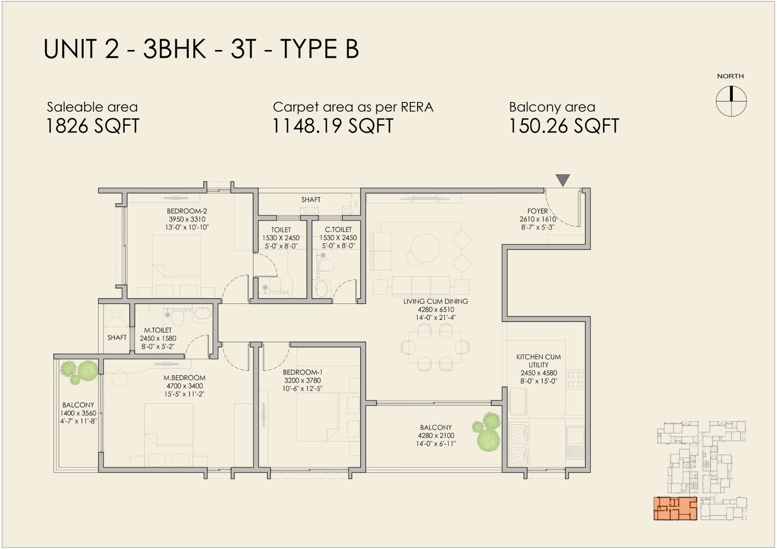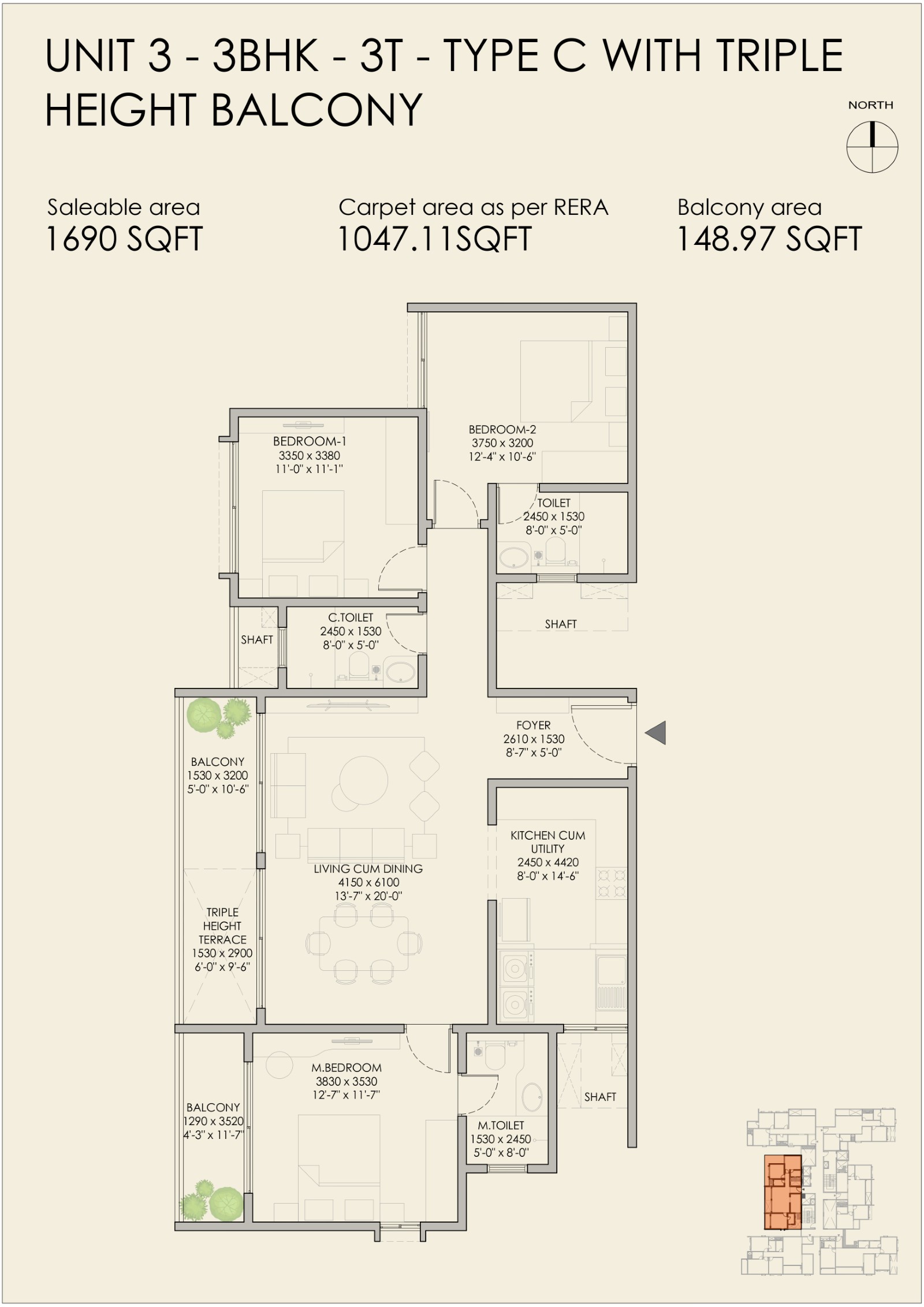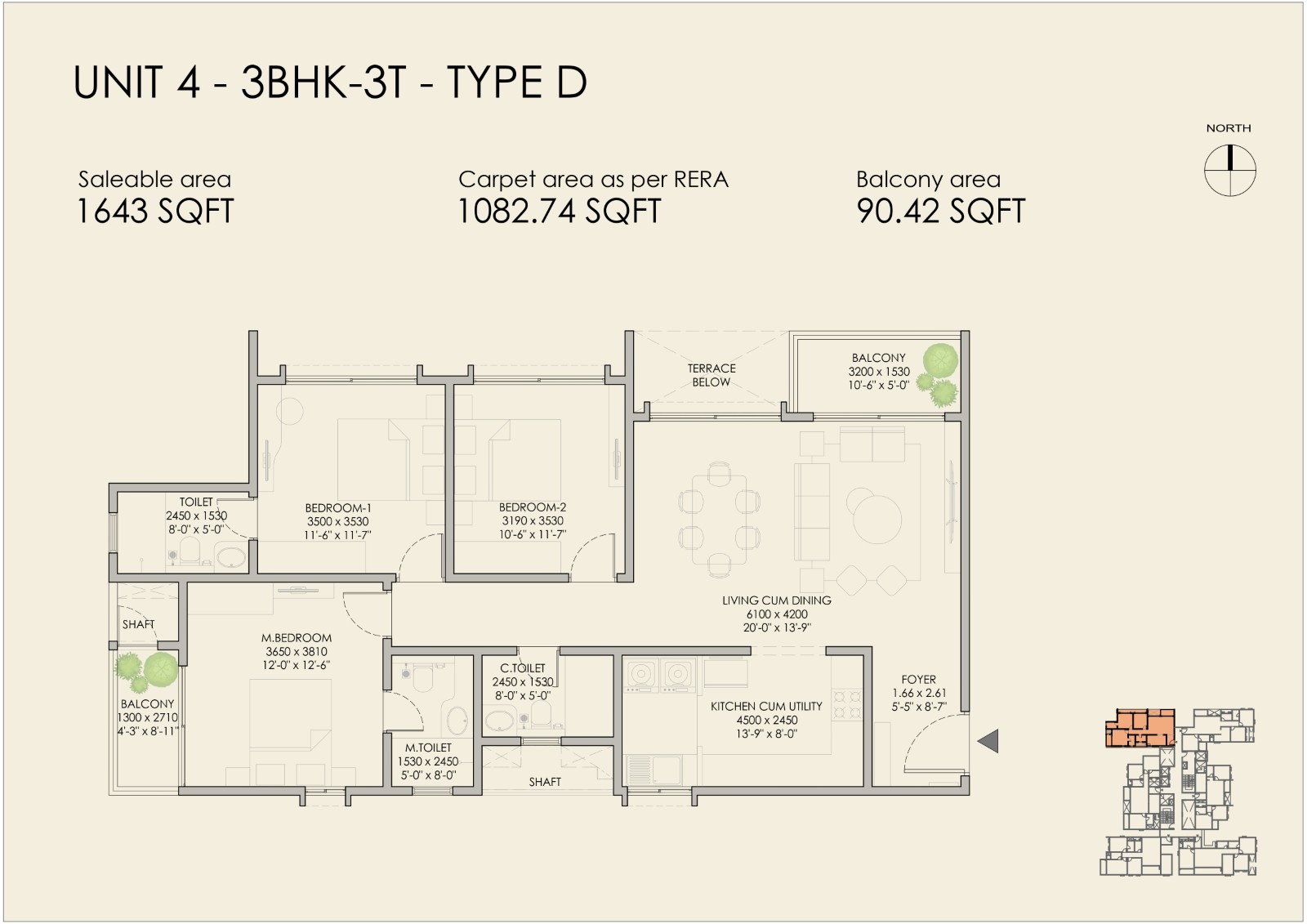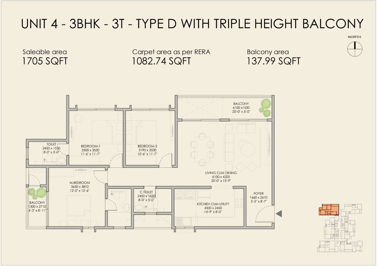 The area of 3BHK apartments ranges from 1618 Sqft to 1826 Sqft. Each home is meticulously designed with no common walls and features 2 balconies, optimizing space utilization and natural light. All residences are built using advanced MIVAN Construction for superior quality and durability.