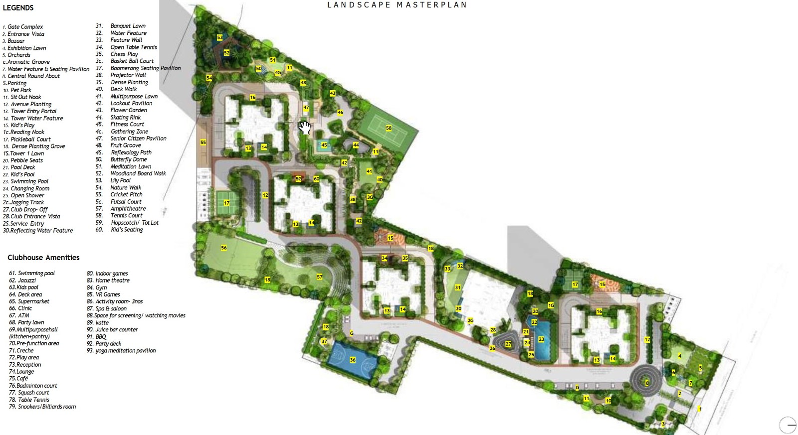 NBR Soul Of The Seasons boasts a grand 40,000 Sqft World Class Clubhouse, complemented by a wide range of 70+ Sports, Fitness & Leisure Amenities. These include a Swimming Pool with Kids Pool, Multipurpose Hall, Outdoor Workstation, Library, Indoor Games, Table Tennis, Yoga Court, Well Equipped Gym, Kids Play Area, Open Gym, Yoga Lawn, Foot Reflexology, Toddlers Play Area, Elders Park, Cricket Pitch, Party Lawn, and much more, catering to all age groups.